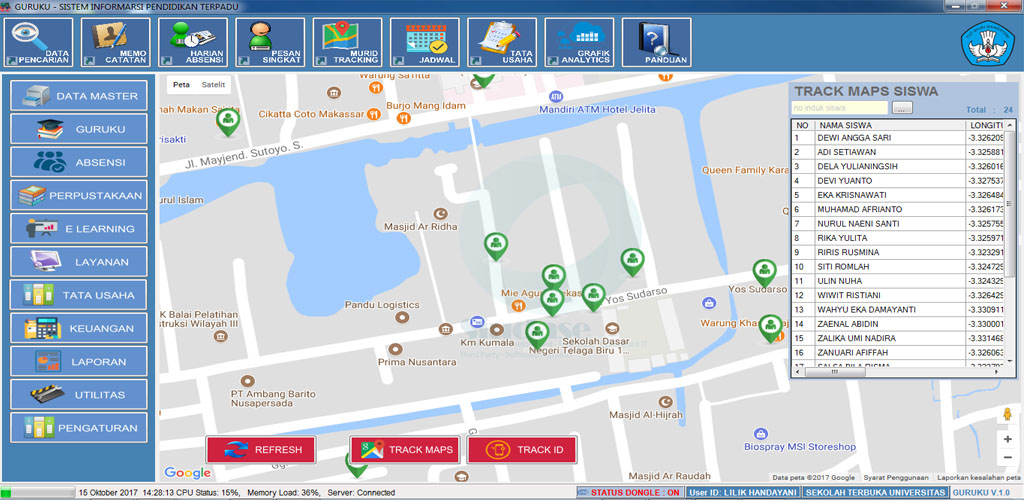 Modul pada Aplikasi Guruku terdapat monitoring siswa atau siswi selama masa jadwal sekolah berlangsung. Pemantauan lokasi keberadaan siswa atau siswi disini berfungsi untuk melakukan perlindungan terhadap anak dari proses keberangkat sekolah, dalam sekolah, hingga pulang sekolah sampai dirumah masing-masing.