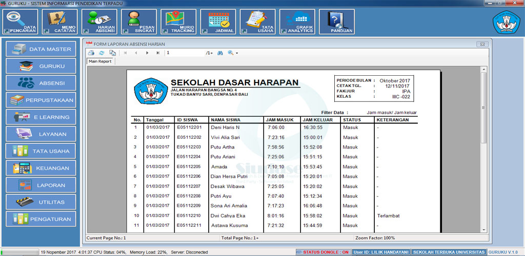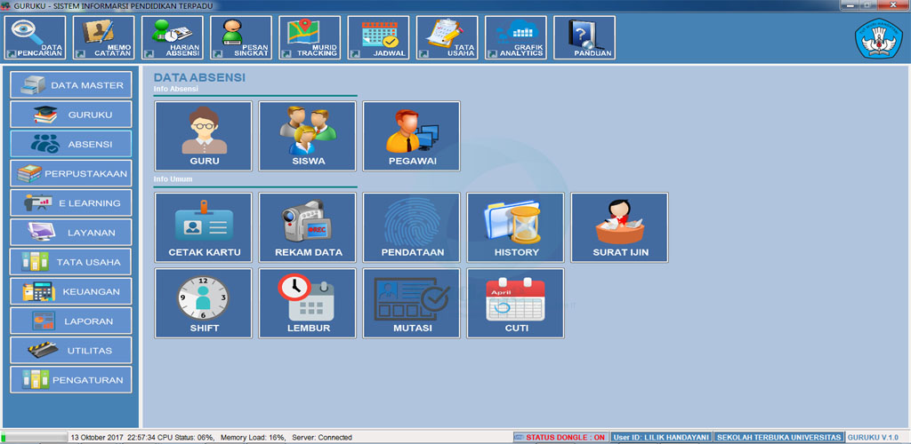 Modul Guruku Absensi digunakan untuk informasi absensi harian pada siswa siswi yang secara rutin, aplikasi ini mencatatan tingkat kehadiran murid melalui perangkat keras seperti finger print, kartu akses dan lainnya, aplikasi absensi ini hanya diperuntukan bagi murid siswa siswi, tidak termasuk bagi guru yang hadir, sistem kerja aplikasi ini tidak jauh beda dengan aplikasi Absensi A1000 yang kita miliki.