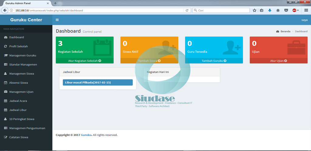 Siudase berusaha memberikan bagian dalam bidang pendidikan dan ilmu pengetahuan. Dengan pengembangan aplikasi Guruku dapat digunakan sebagai patokan aplikasi terpadu yang terpusat dari sekolah / kampus dan dengan berkomunikasi pada mahasiswa siswa siswi murid yang dimilikinya. Aplikasi Guruku digunakan sebagai update informasi yang dimiliki sekolah, diantaranya jadwal ujian, absensi, tugas dari guru, peringkat nilai, laporan hasil nilai, komunikasi antara siswa guru dan orangtua, jadwal libur, ujian, acara kegiatan, pengumuman, komunikasi perpesanan, data guru, data siswa, dan masih banyak lagi menu aplikasi yang dapat ditambahkan yang disesuaikan dari sekolah atau kampus.