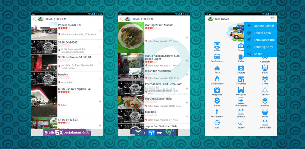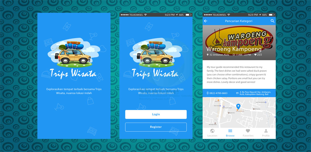 Trips Wisata, merupakan aplikasi online yang membantu traveler atau pengguna wisatawan untuk mencari lokasi tempat-tempat wisata yang indah di indonesia, tentunya aplikasi ini juga di fasilitasi menu pendukung lainnya, terutama pada menu-menu seperti hotel, tempat makan, restoran, bank atm, hotel, pom bensin, mall, supermarket, tour travel, dan lain sebagainya. Jadi aplikasi online Trips Wisata dapat digabungkan dengan menu-menu yang telah disediakan, sehingga tidak membuat bingung pada traveler untuk berpergian jauh. aplikasi ini tergolong gratis, mengingat aplikasi ini tidak seperti Aplikasi Trips Wisata Corporate.